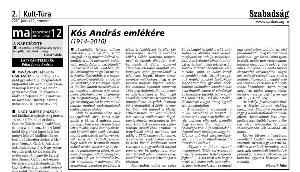 Múlt év novemberében még ünnepeltünk. Szép, kerek évfordulót: a 95.-et. A művész mint mindig, akkor is bizakodón tekintett a jövoöe, bár a komoly fizikai erőt követelő alkotástól, a szobrászattól már búcsút kellett vennie, sőt, arra sem vállalkozhatott, hogy rendezze borjúmáli műtermének kertjét, ahová még 90 évesen is rendszeresen ki.járt, és fiatalokat meghazudtoló energiával