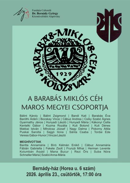 Idén a szokásosnál hamarabb, április 23-án, csütörtökön lép közönség elé a Barabás Miklós Céh Maros megyei csoportja. Kiállításuk szokásos színhelye a marosvásárhelyi Bernády Ház. A megnyitóra 17 órától kerül sor. A BMC zászlaja alatt tömörült alkotók és meghívottjaik a vizuális művészetek minden ágát és a művészek mindenik nemzedékét képviselik. Többségükben marosvásárhelyi festők, grafikusok, szobrászok, textilművészek, fotósok, formatervezők mutatkoznak be az alakulat immár 11. ilyen közös megnyilvánulásán, de máshonnan is számos olyan képzőművész nevez be a tárlatra, akiknek jelenléte élményteljes találkozást ígér a helybeli művészetkedvelőknek