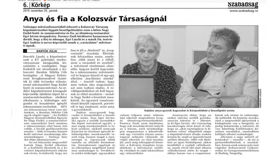 2019. november 26-án, a Kolozsvár Társaság „Képzőművészek a KT palettáján” sorozat keretén belül, Nagy Enikő festő-és zománcművész és fia, Egri István üvegművész és ólomüveg restaurátor voltak a vendégek, akiknek Ferencz Zsolt volt a beszélgetőtársuk. Házigazda, Horváth László volt.