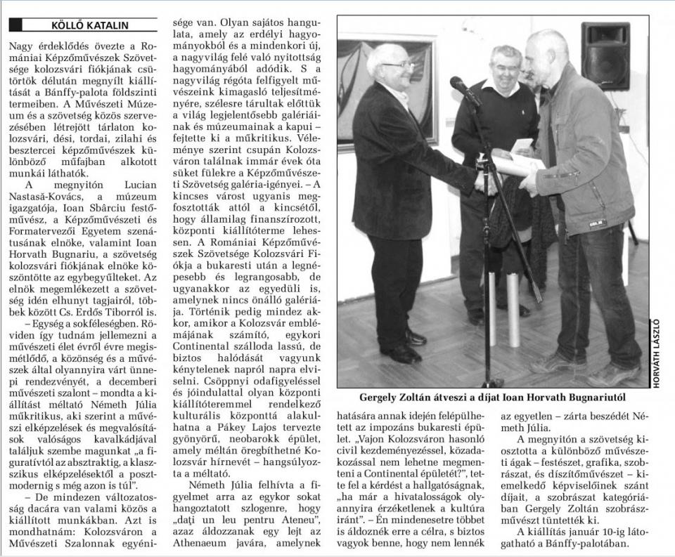 – De mindezen változatosság dacára van valami közös a kiállított munkákban. Azt is mondhatnám: Kolozsváron a Művészeti Szalonnak egyénisége van. Olyan sajátos hangulata, amely az erdélyi hagyományokból és a mindenkori új, a nagyvilág felé való nyitottság hagyományából adódik. S a nagyvilág régóta felfigyelt művészeink kimagasló teljesítményére, szélesre tárultak előttük a világ legjelentősebb galériáinak és múzeumainak a kapui – fejtette ki a műkritikus. Véleménye szerint csupán Kolozsváron találnak immár évek óta süket fülekre a Képzőművészeti Szövetség galéria-igényei.