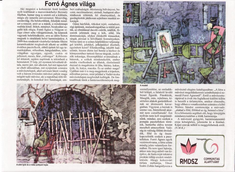 Aki megnézi a kolozsvári festő kedden nyílt kiállítását a marosvásárhelyi Bernády Házban, hamar meg is szereti ezt a különös, mégis oly ismerős univerzumot. Mesevilág, csodavilág. Ha belekerülünk, feledjük mindazt a rosszat, amit az a másik, a mindennapi realitás kínál. Békét, reményt, bizakodást sugalló kék elégia. Forró Ágnes a Világom világa címet adta válogatásának, ha képesek vagyunk belefeledkezni, arra az időre biztos magunk is rátalálunk belső harmóniánkra. A 2009-ben rendezett vásárhelyi tárlatán főként keramikusként megkedvelt alkotó az utóbbi években pasztellezik, ebből épített fel egy tematikájában, stílusában, hangulatában, színvilágában egységes, egyedi, csakis rá jellemző, mesés, lírai „valóságot”. Költészettel átitatott, sajátos naplónak is tekinthető a bemutatott 35 kép, jól nyomon követhető általa, merre járt, mit alkotott, hol mit tapasztalt az eltelt időszakban, mit nyújtottak számára a művésztelepek, ahol szívesen látott vendég volt a három évtizedes művészi pályát maga mögött tudó művész, aki a napokban tölti 60. esztendejét, és konokul őrzi fiatalságát, emberi szabadságát. Mostanság bálványosi, bucsini, mezőmadarasi, sárándi, budapesti alkotótáborok töltötték fel élményekkel, és gazdagították játékosan sejtelmes munkái sokaságát.