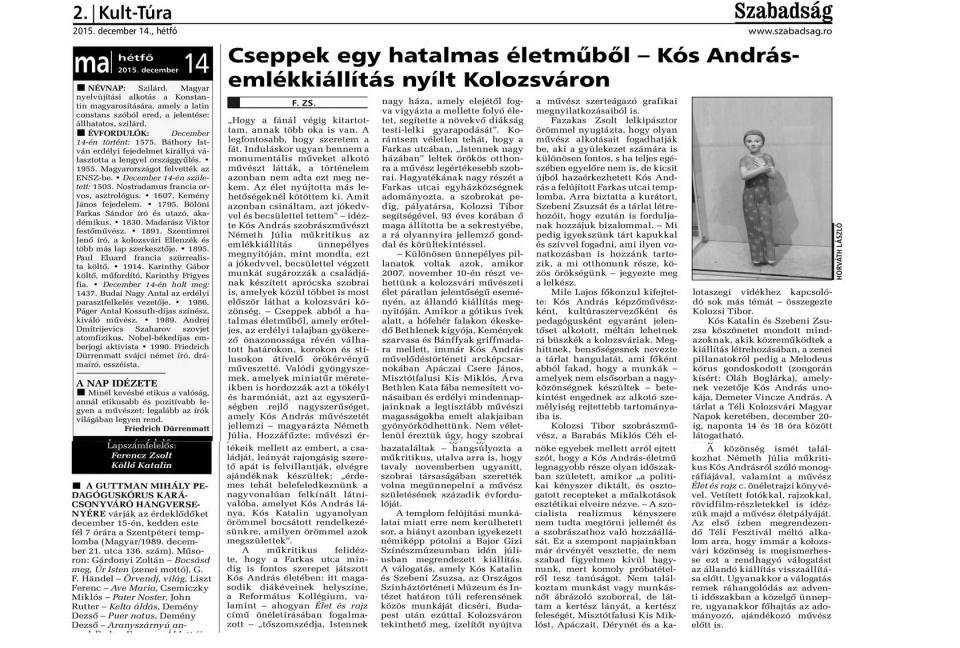 Az erdélyi, az összmagyar és az európai szobrászat emblematikus alakja előtt tiszteleg a Magyarország Kolozsvári Főkonzulátusa, a Kolozsvár-Belvárosi Református Egyházközség, az Országos Színháztörténeti Múzeum és Intézet, a Barabás Miklós Céh, a Carola Egyesület, valamint Kós András örökösei együttműködésében létrejött tárlat, egyfajta előzeteseként annak az állandó kiállításnak, amelyet Kolozsi Tibor szobrászművész, a BMC elnöke rendez majd be, a mester eredeti elképzeléseinek megfelelően.