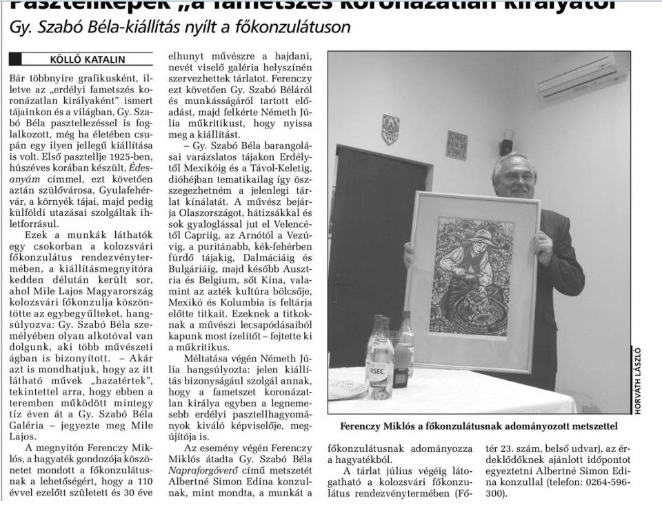Ezek a munkák láthatók egy csokorban a kolozsvári főkonzulátus rendezvénytermében, a kiállításmegnyitóra kedden délután került sor, ahol Mile Lajos Magyarország kolozsvári főkonzulja köszöntötte az egybegyűlteket, hangsúlyozva: Gy. Szabó Béla személyében olyan alkotóval van dolgunk, aki több művészeti ágban is bizonyított. – Akár azt is mondhatjuk, hogy az itt látható művek „hazatértek”, tekintettel arra, hogy ebben a teremben működött mintegy tíz éven át a Gy. Szabó Béla Galéria – jegyezte meg Mile Lajos.