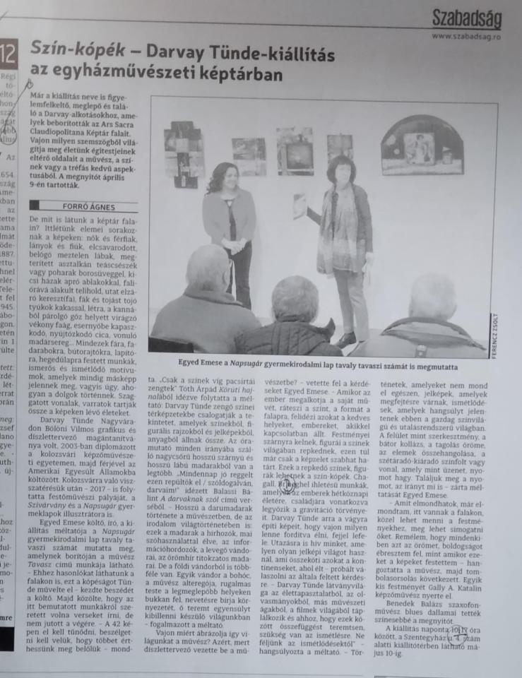 Egyed Emese költő, író, a kiállítás méltatója a Napsugár gyermekirodalmi lap tavaly tavaszi számát mutatta meg, amelynek borítóján a művész Tavasz című munkája látható. – Ehhez hasonlókat láthatunk a falakon is, ezt a kópéságot Tünde művelte el – kezdte beszédét a költő. Majd közölte, hogy az itt bemutatott munkákról szeretett volna verseket írni, de nem jutott a végére. – A 42 képen el kell tűnődni, beszélgetni kell velük, hogy többet érthessünk meg belőlük – mondta. „Csak a színek víg pacsirtái zengtek” Tóth Árpád Körúti hajnalából idézve folytatta a méltató: Darvay Tünde zengő színei térképzetekbe csalogatják a tekintetet, amelyek színekből, figurális rajzokból és jelképekből, anyagból állnak össze. Az óramutató minden irányába szálló nagycsőrű hosszú szárnyú és hosszú lábú madarakból van a legtöbb. „Mindennap jó reggelt ezen repültök el / szóldogálván, darvaim!” idézett Balassi Bálint A darvaknak szól című verséből. – Hosszú a darumadarak története a művészetben, de az irodalom világtörténetében is: ezek a madarak a hírhozók, mai szóhasználattal élve, az információhordozók, a levegő vándorai, az örömhír titokzatos madarai. De a földi vándorból is többféle van.  Egyik vándor a bohóc, a művész alteregója, rugalmas teste a legmeglepőbb helyeken bukkan fel, nevetésre bírja környezetét, ő teremt egyensúlyt kibillenni készülő világunkban – fogalmazott a méltató.